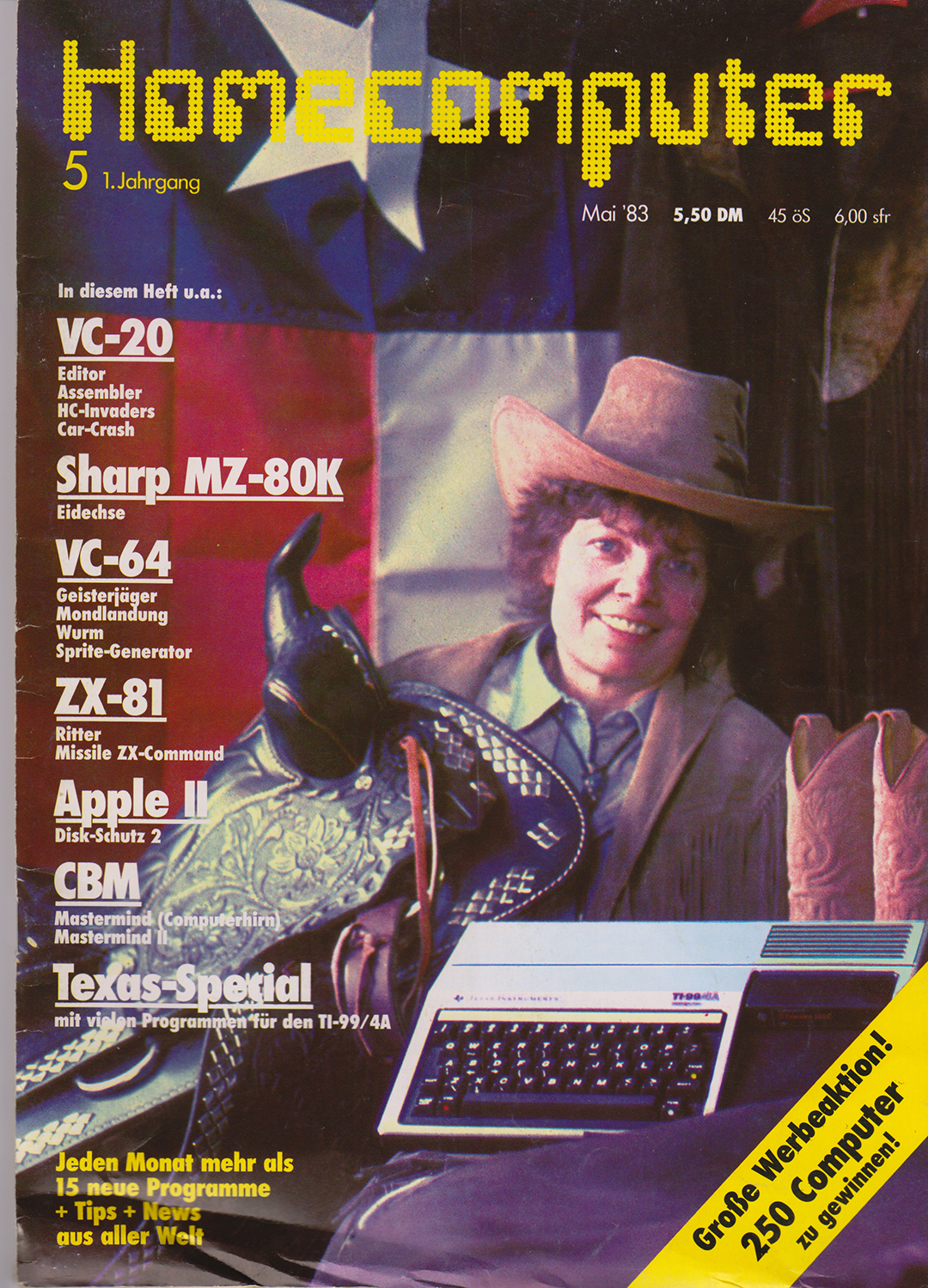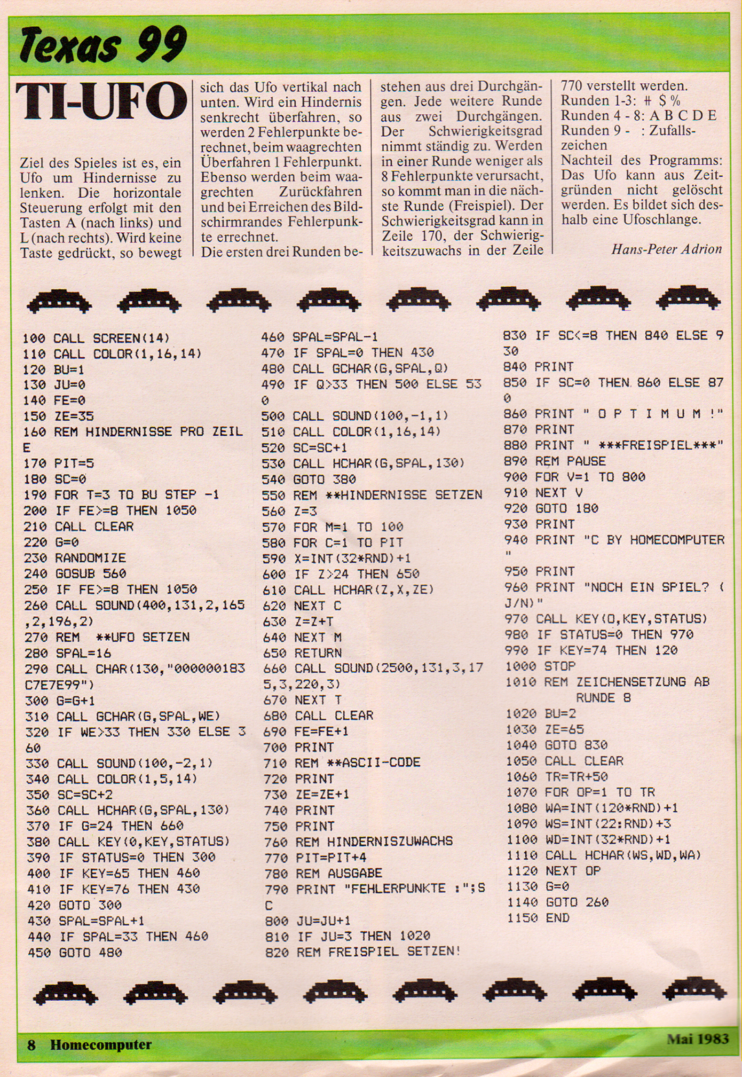 Das andere Heft war eine Zeitschrift mit Programm-Listings zum eintippen mit Namen Homecomputer. Viele dieser Listing waren auch für Spiele. In der Ausgabe 5/83 war, unter anderem, das Listing für eine Art Moon Lander für den TI99-4A von Texas Instruments.
