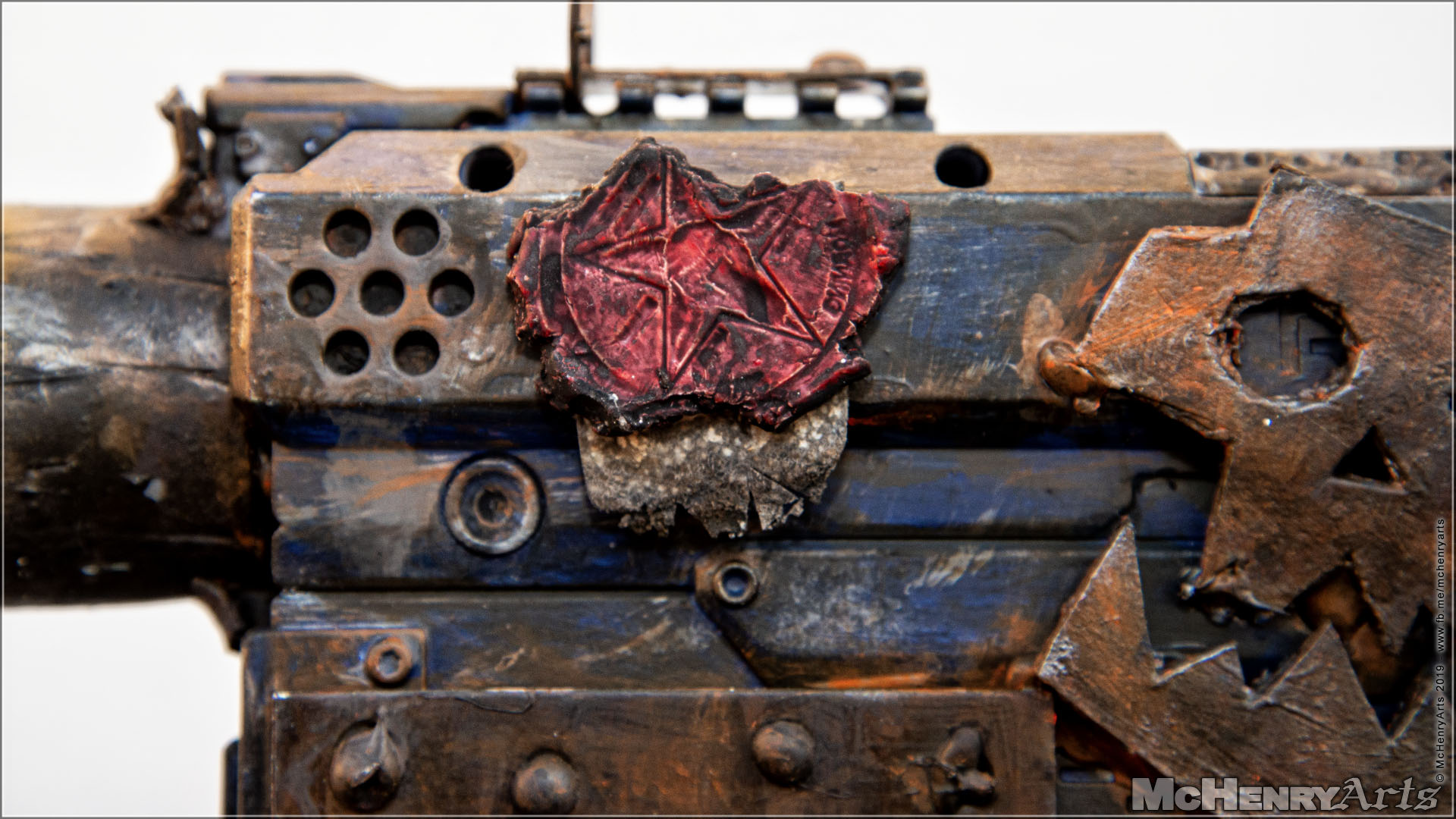 Das Ork-Schädel-Logo ist aus 5mm dicker Pappe ausgeschnitten. Vor dem bemalen mit mit Stahl-Farbe wurde die Pappe mit verdünnten Holzleim versiegeln. Zum Anschluss gab es dann noch ein Weathering mit verschiedenen Rostfarben. Ebenso Weathering ich einige Metallteile, Belschläge, etc.