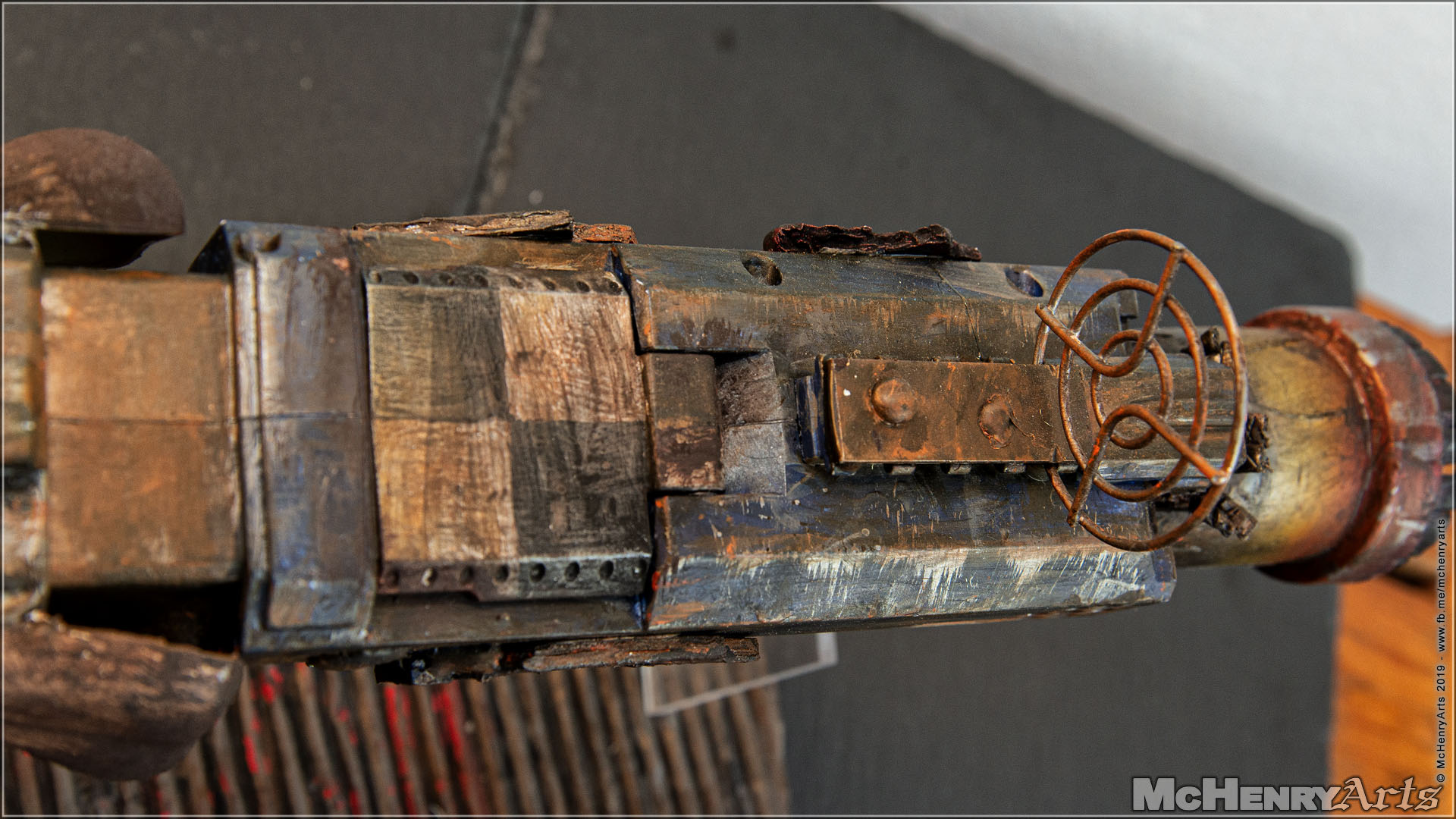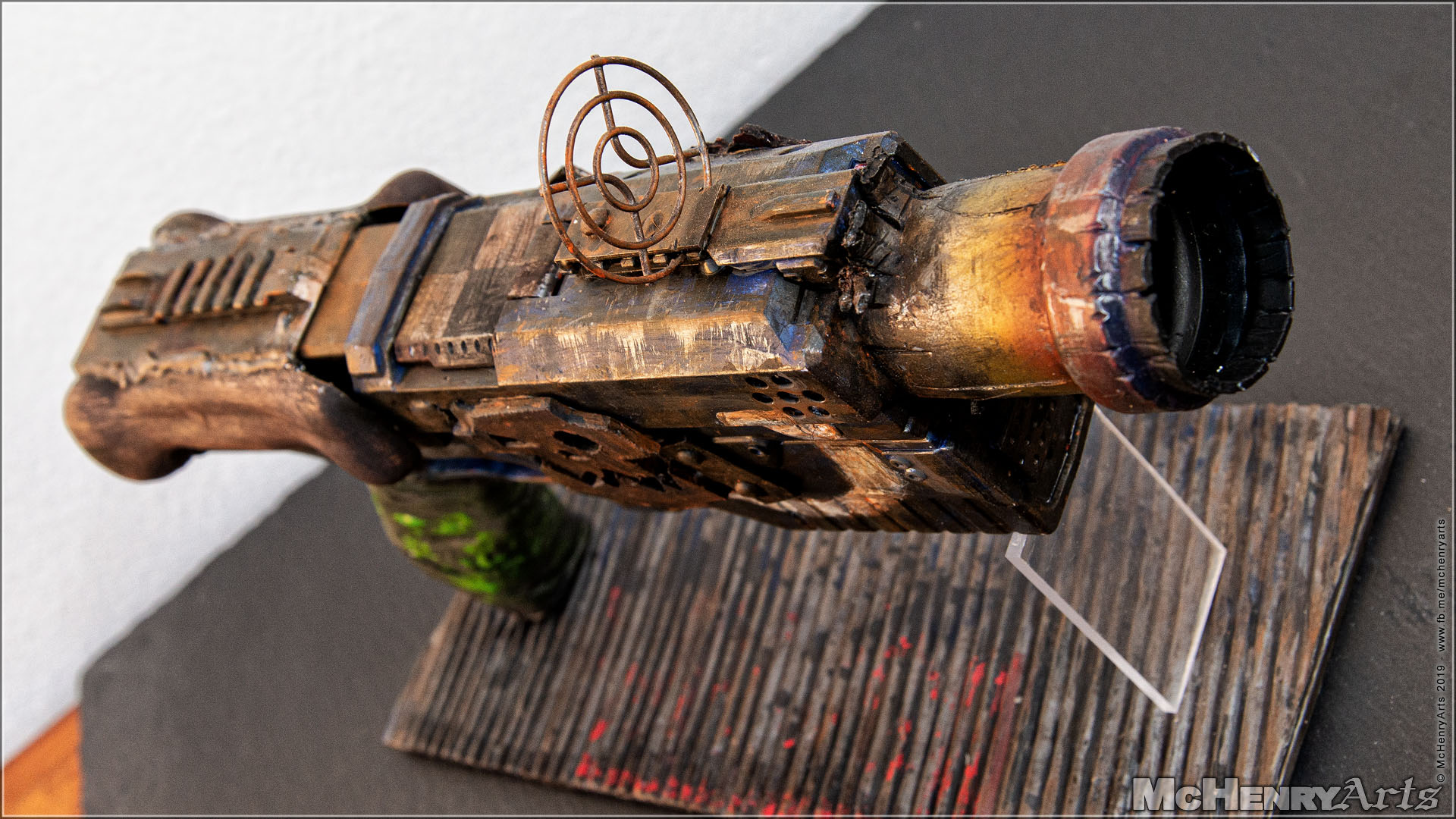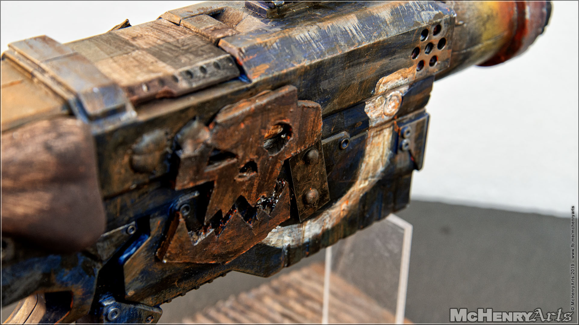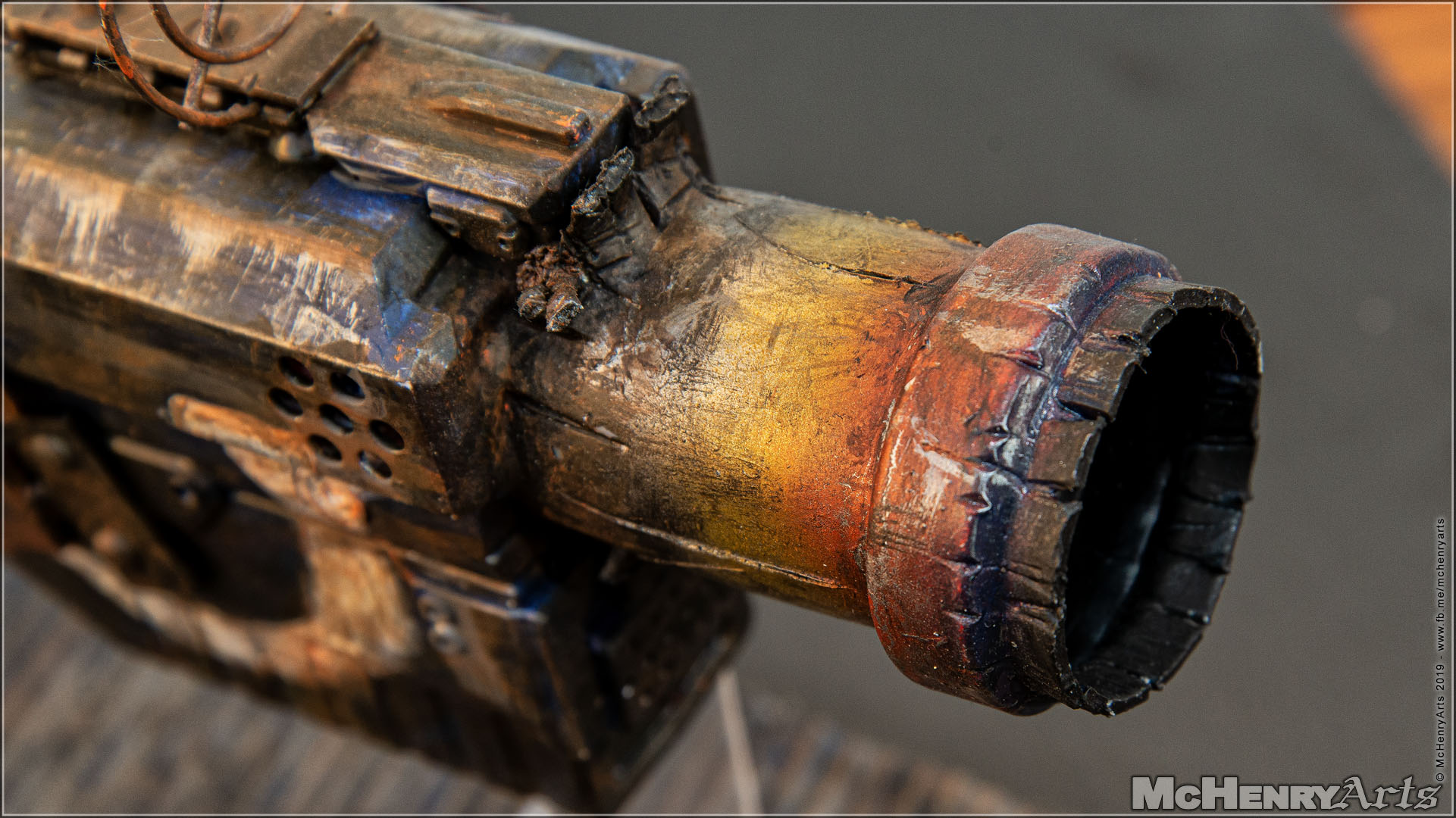 Die Mündung besteht aus einem Stück (Abfluss-)Plastikrohr, versehen mit diversen Beschädigung. Bemalt zuerst mit Gunmetal als Untergrund und dann den überhitztes Metall Effekt mit einem Airbrush aufgetragen. Um diesen Effekt richtig hinzubekommen, habe ich mir erst mal einige Youtube-Videos anschauen müssen.