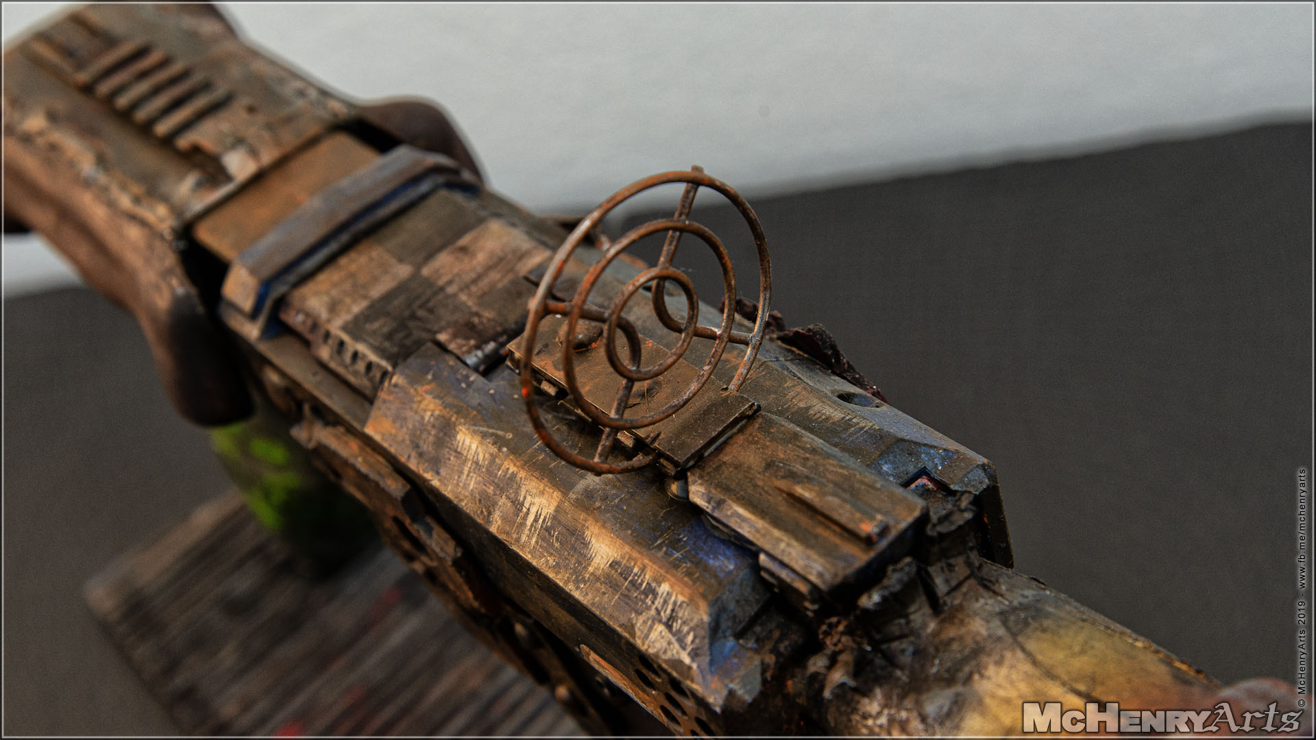 Das „Fadenkreuz“ ist ein Lüftungsgitter aus einem alten PC-Netzteil. Wieder mit Stahl-Farbe und einem Weathering aus verschiedenen Rostfarben „aufgearbeitet“.