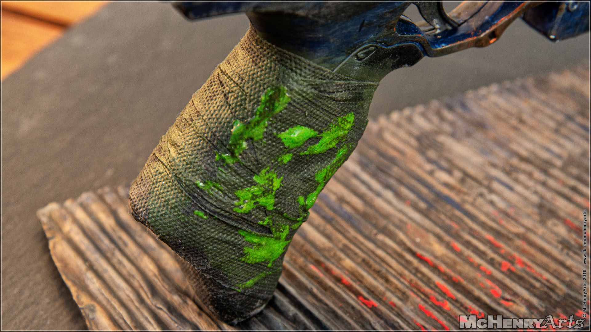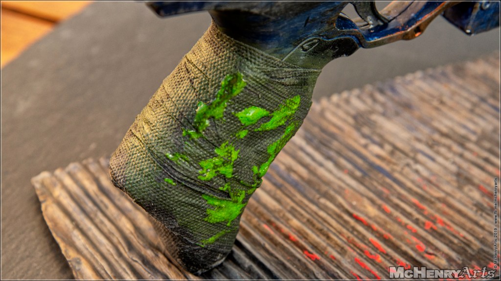 Der Griff ist mit Stoff-Bandagen umwickelt, zum verkleben wurden die Stoffstreifen in einer Wasser / Holzleim Mischung getränkt. Nach dem Aushärten erfolgte das Weathering mit Blackwash und Typhus Corrosion gewettert. Die grünen Tropfen sind UV Resin gemischt mit Tesseract Glow .