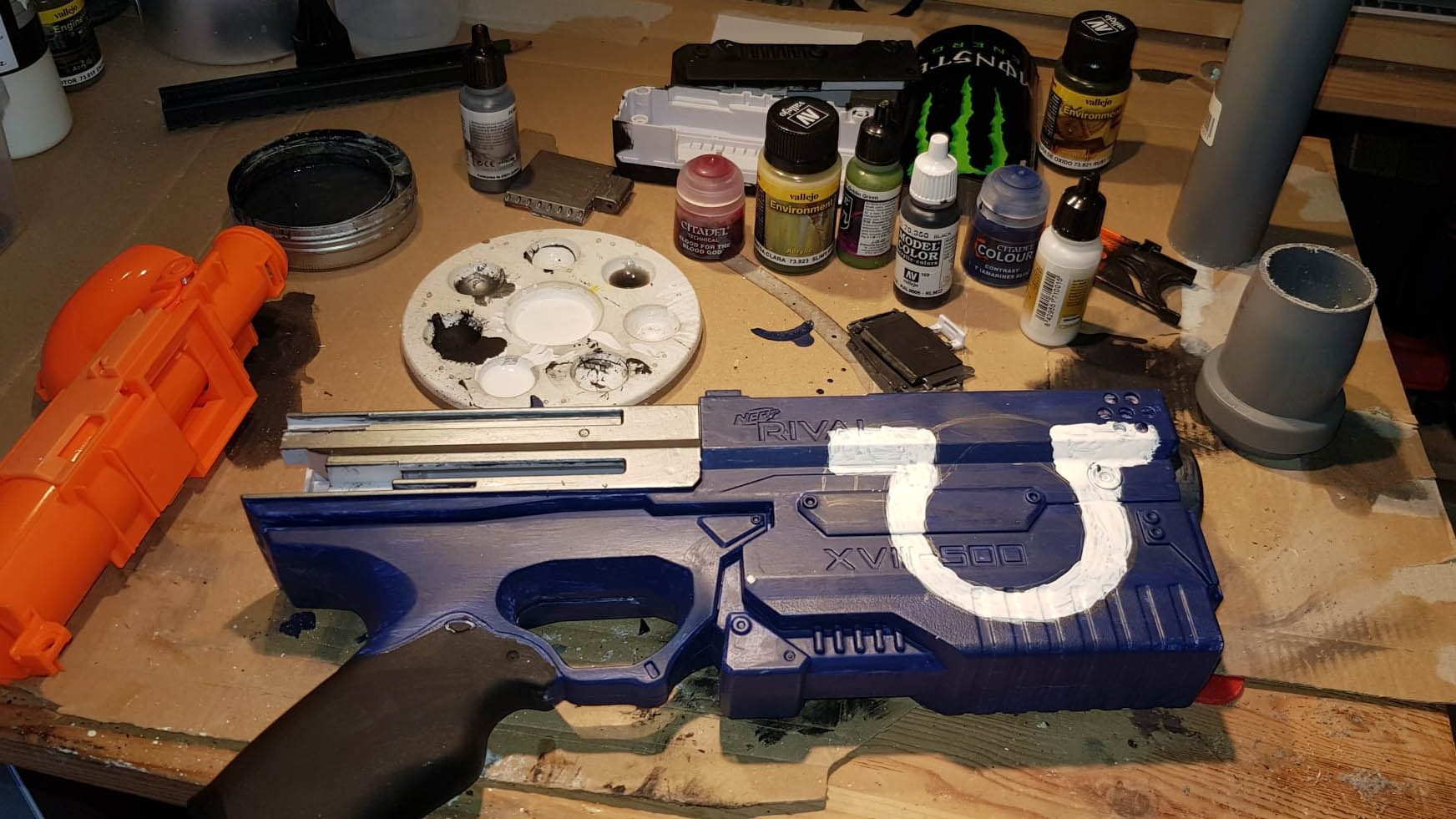 Die Planungsphase war erstmal verhältnismäßig einfach. Die ganze Nerf in Ultramarine-Blau anmalen und mit dem Omega-Logo versehen. Anschließend dann nach Gefühl das ganze “ver-Ork-en”, mit dem was ich so alles in meinen Schrott- / Reste-Kisten finde