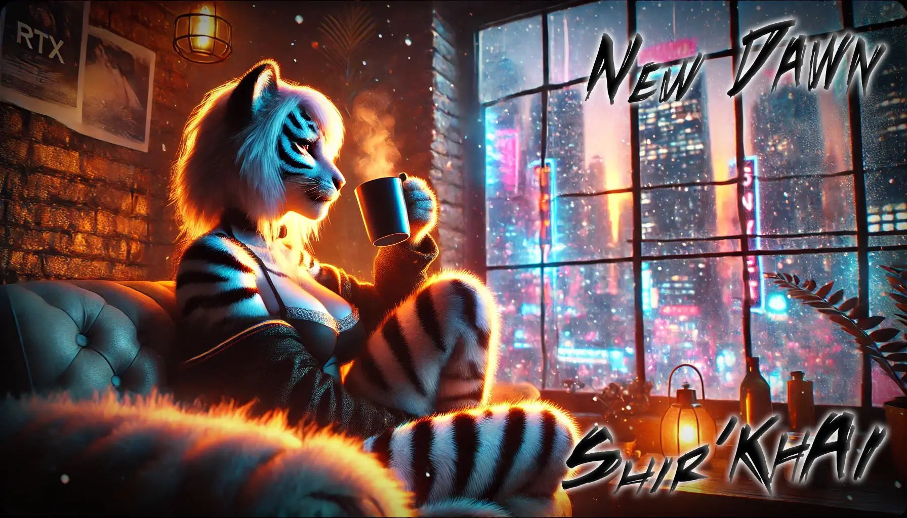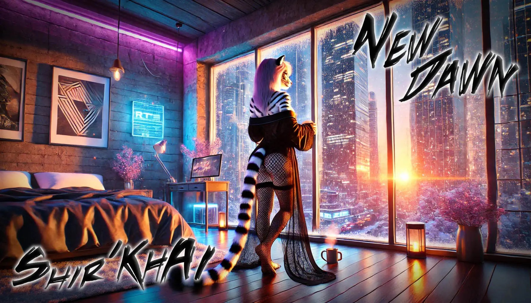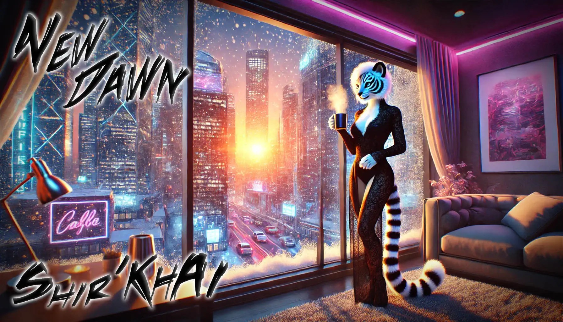 Keywords: artwork, art, ai, aiart, aiartwork, artoftheday, dalle, anthropomorphic, FurryFandom, AnthroArt, catgirl, fur, FurryArtist, nerd, geek , furry, cat , dawn, new year