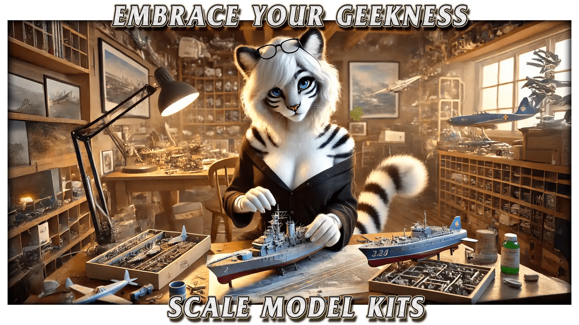 Anthropomorphic white tiger assembling a large scale model ship at a hobby desk surrounded by model kits, tools, and completed mechs and vehicles, captioned "Embrace Your Geekness – Scale Model Kits". Keywords: scale models, model kits, white tiger, anthropomorphic, hobbyist, ship model, diorama, mech models, geek culture, crafting, assembly workspace