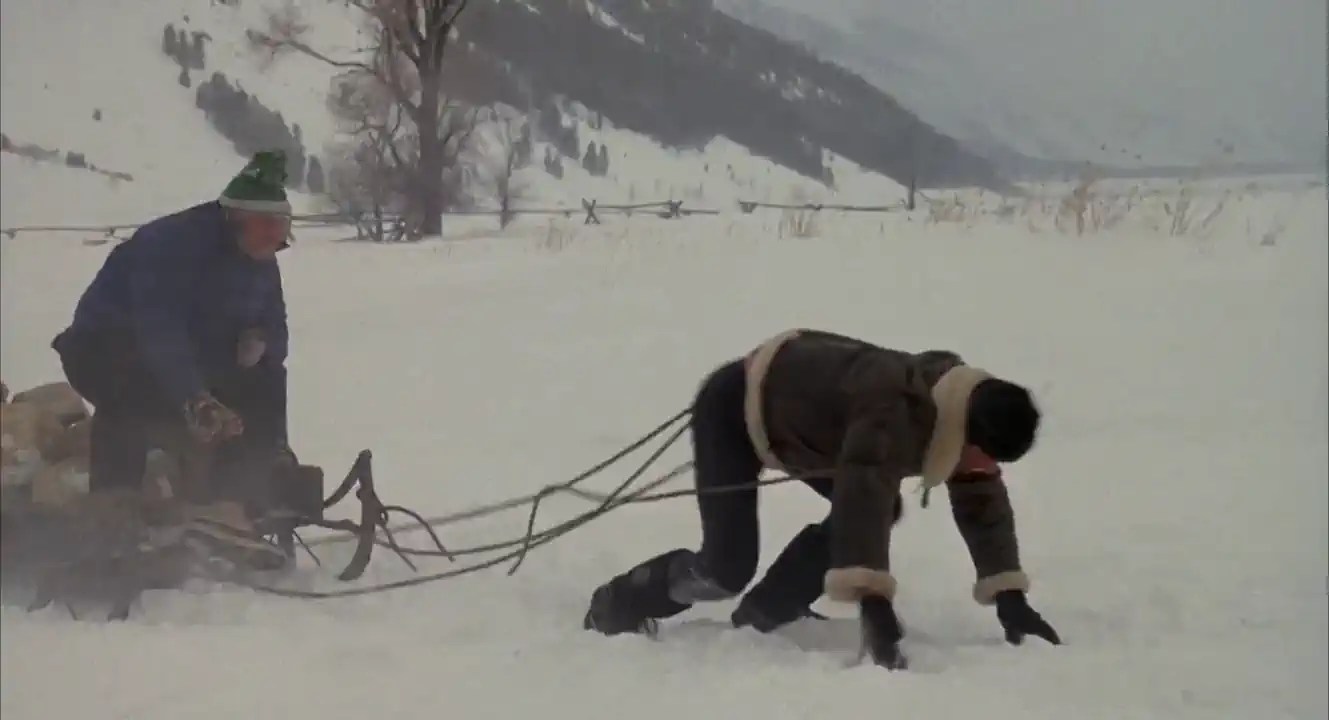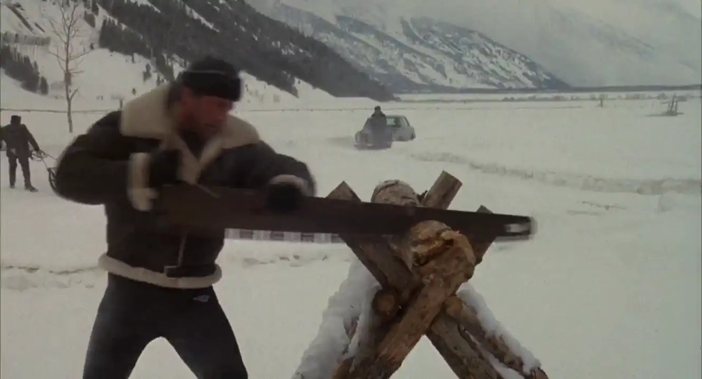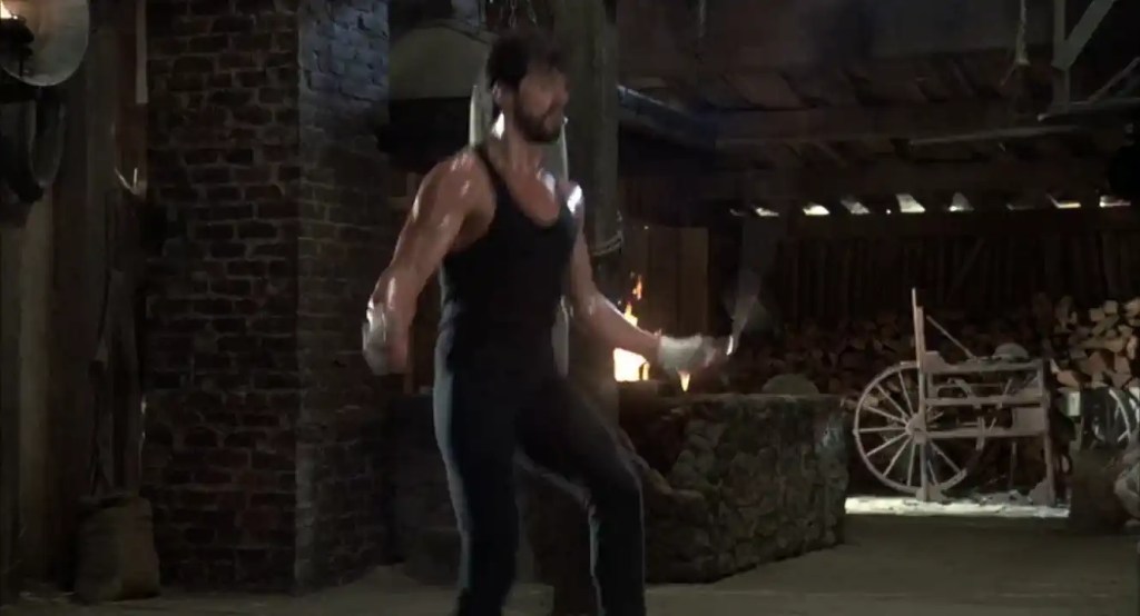 Rocky leaves his comfortable life behind and retreats to the icy, snow-covered expanses of Siberia, where he trains with simple equipment, hard physical labor, the power of nature, and unshakeable will. He drags tree trunks, chops wood, pulls heavy loads through deep snow, and battles the elements—all as an expression of his belief in human determination and genuine strength born of one’s own power. At the same time, the film shows Drago in hyper-modern training facilities, monitored by scientists, sensors, and machines, accompanied by performance charts and technical perfection—a clear, visually striking contrast between “heart and soul” on the one hand and “cold technical optimization” on the other.