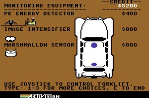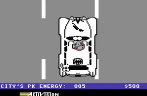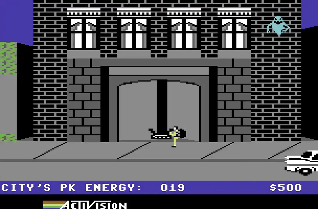 Ghostbusters on the C64 is an unusual genre mix of strategy, business simulation, and action. The game mechanics begin with the establishment of your own Ghostbusters company: the player gives their company a name, selects a vehicle – from a simple VW Beetle to a converted ambulance – and equips it with various ghost-catching devices, including PKE meters, ghost traps, super catchers, and even improved storage upgrades. The choice of equipment has a significant impact on the team’s efficiency, which adds an interesting tactical component to the game. Then the actual ghost hunt begins in the city haunted by paranormal activity, which is depicted as an abstract metropolis with streets, intersections, and landmark buildings.