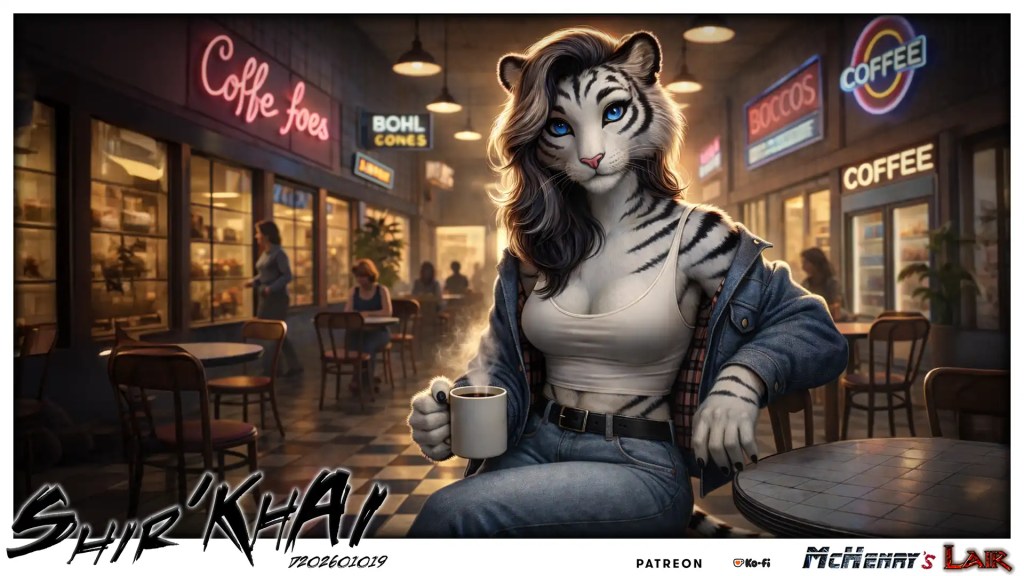 My Daily #Coffee – If you like my content: https://mchenryslair.com/#support me https://ko-fi.com/mchenryslair – And you will receive a unique #AI #Wallpaper of my #Fursona Shir’KhAI#AnthroArt #Art #catgirl #furry #Geek #GenX #Nerd #SupportArtists #Donate #KoFi #CoffeeLover #DigitalArt#sexy #nice