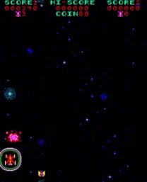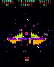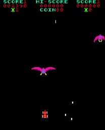 The way enemies react to hits also adds variety. The larger bird-like enemies in the middle waves are particularly interesting from a gameplay perspective because they aren’t just destroyed but, in a sense, dismantled piece by piece. Wings can be shot off, body parts remain visible, and some enemies thus appear almost alive or mechanically assembled. For an early arcade game, this is a surprisingly effective form of visual feedback: the player doesn’t just see that an enemy has been hit, but experiences how it changes.